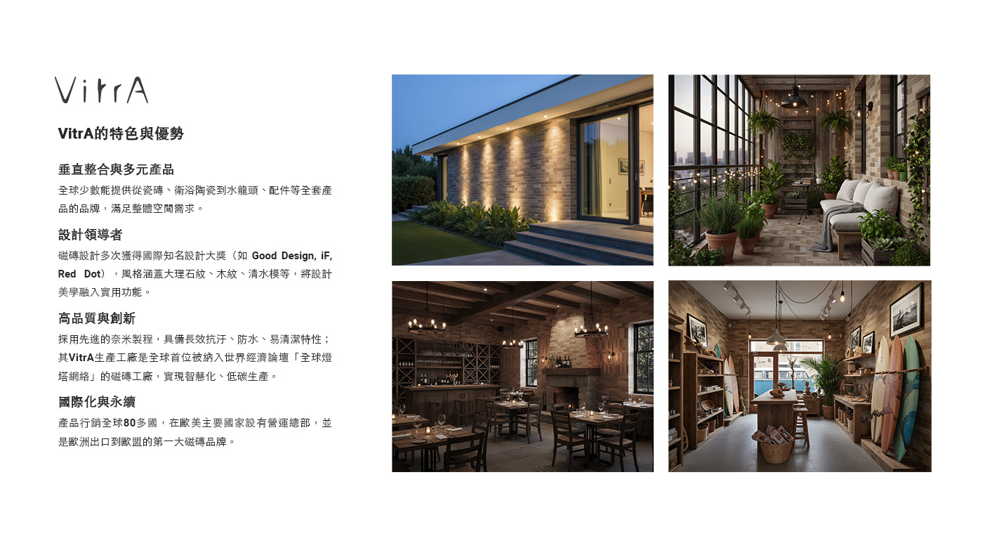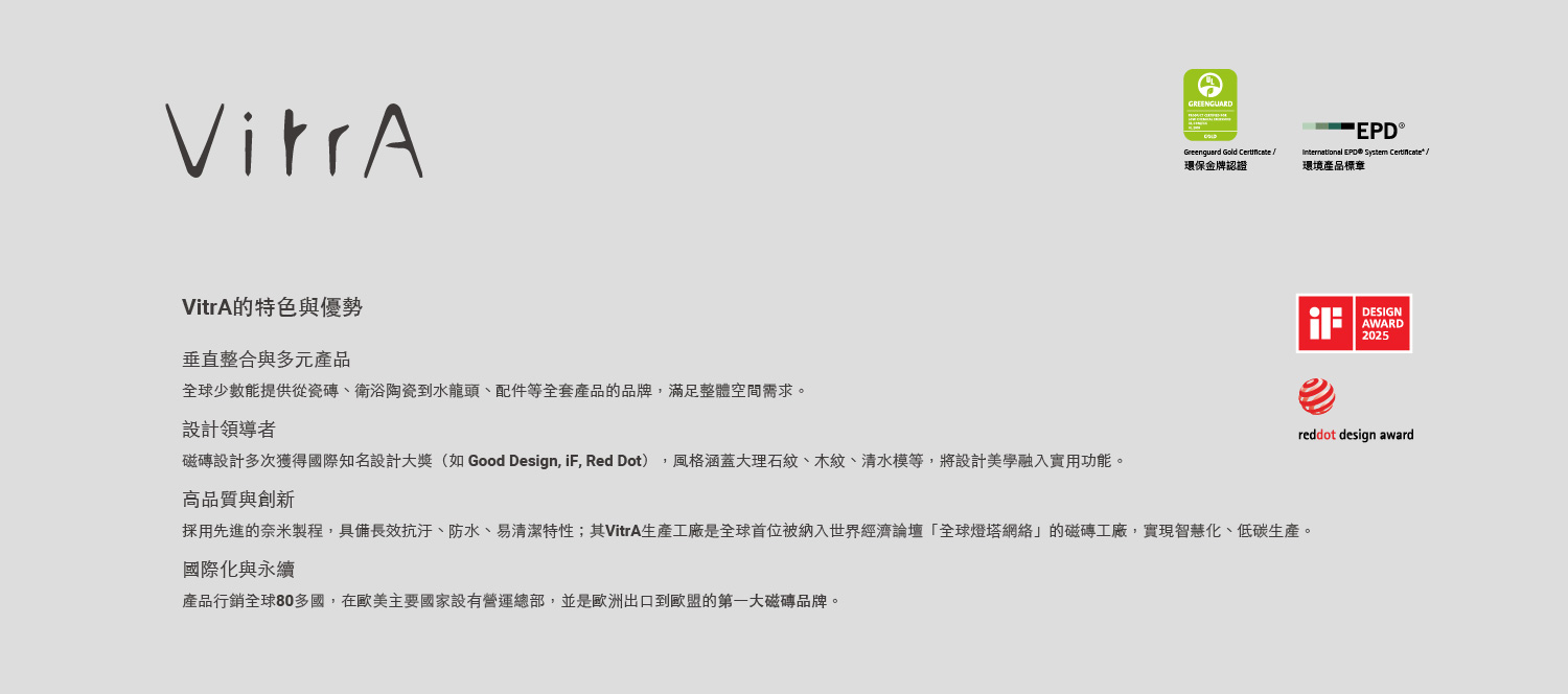 走過70年的品牌價值淬鍊,將環境永續及社會責任,視為製程的重要部分,以提供建築、空間最佳解決方案為目標,屢屢榮獲Good Design、IF、Red Dot、Iconic等國際大獎的新創建材肯定。適合住宅客廳、室內外陽台、廚房磁磚推薦使用,以及飯店、風格餐廳和建築外牆設計規劃。