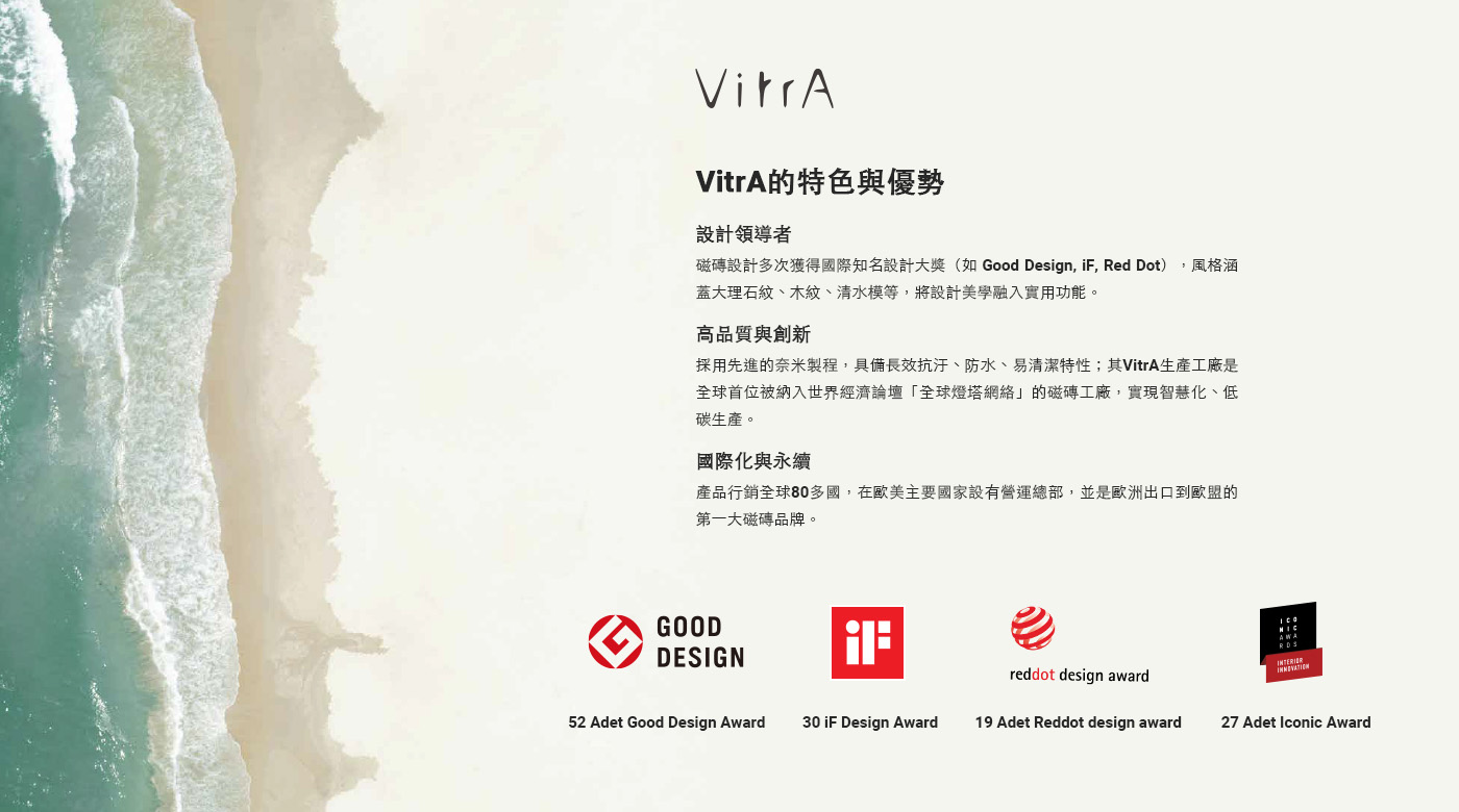 走過70年的品牌價值淬鍊,將環境永續及社會責任,視為製程的重要部分,以提供建築、空間最佳解決方案為目標,屢屢榮獲Good Design、IF、Red Dot、Iconic等國際大獎的新創建材肯定。適合住宅客廳、室內外陽台、廚房磁磚推薦使用,以及飯店、風格餐廳和建築外牆設計規劃。