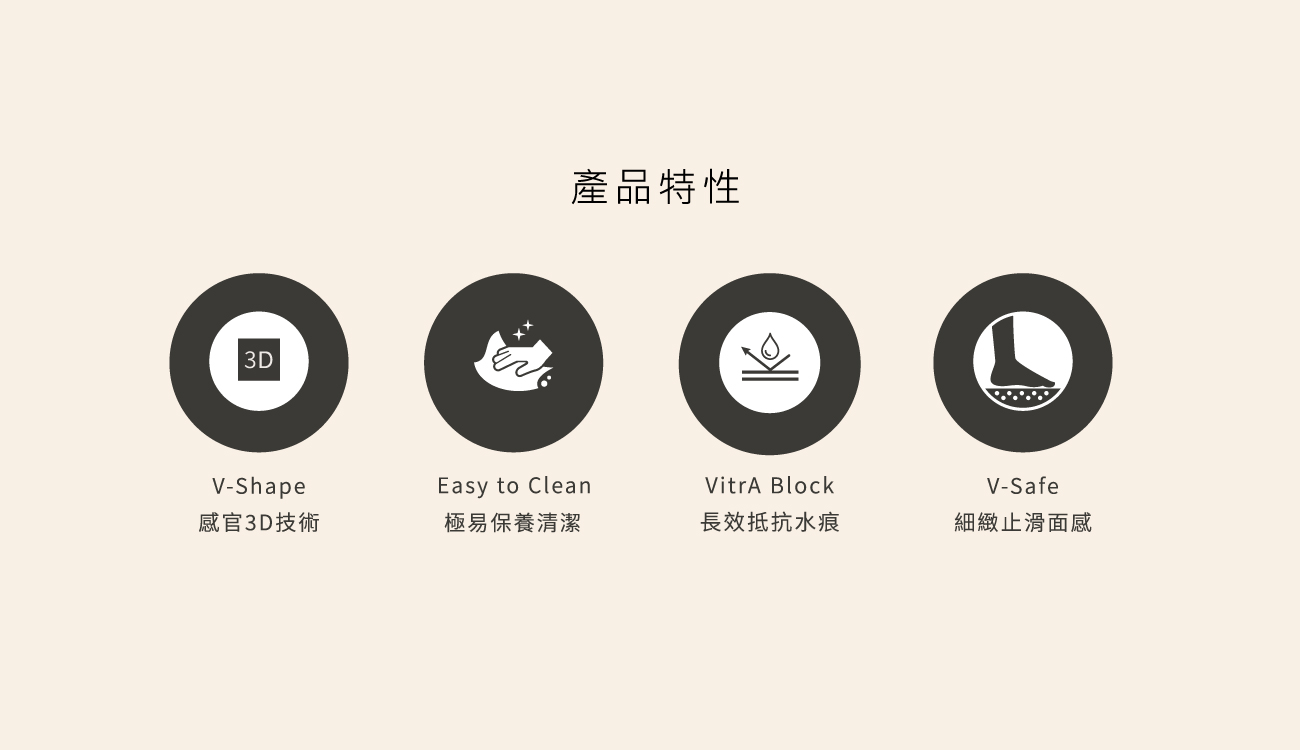 全系列產品採用最新奈米製程,具備長效抗汙、防水痕、易清潔、好保養等特性,