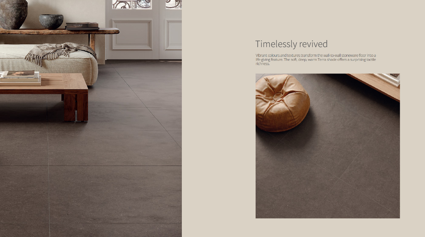 MATERIA 系列,鮮明的色彩與紋理,將磁磚轉化為充滿生命力的核心元素。柔和、深沉而溫暖的 Terra 色調,帶來出乎意料的觸感豐富性。