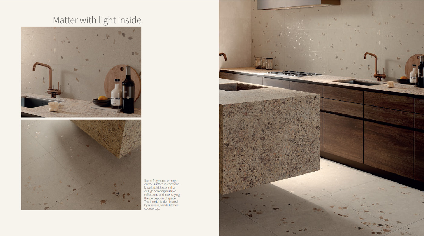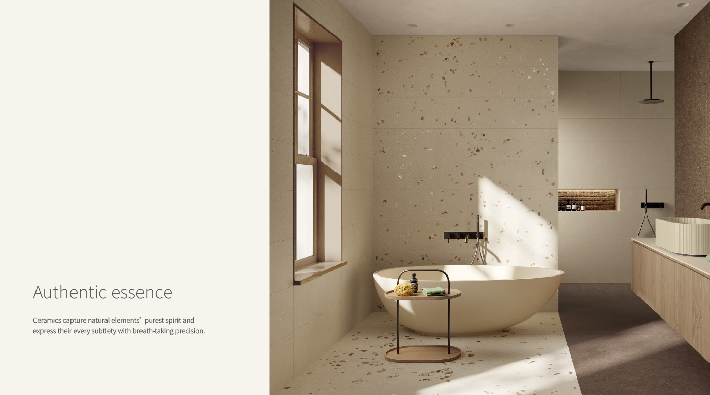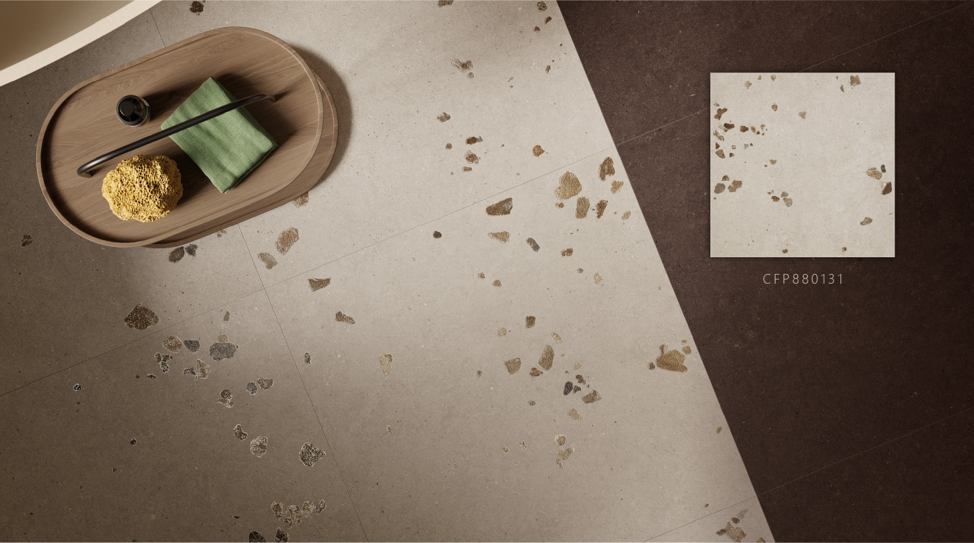 MATERIA 系列,濃烈色彩中的紋理與光澤細節,與飾有卵石裝飾的牆磚形成視覺對話;牆面呈現可觸的礦物質感,同時保有花瓣般的輕盈細緻。