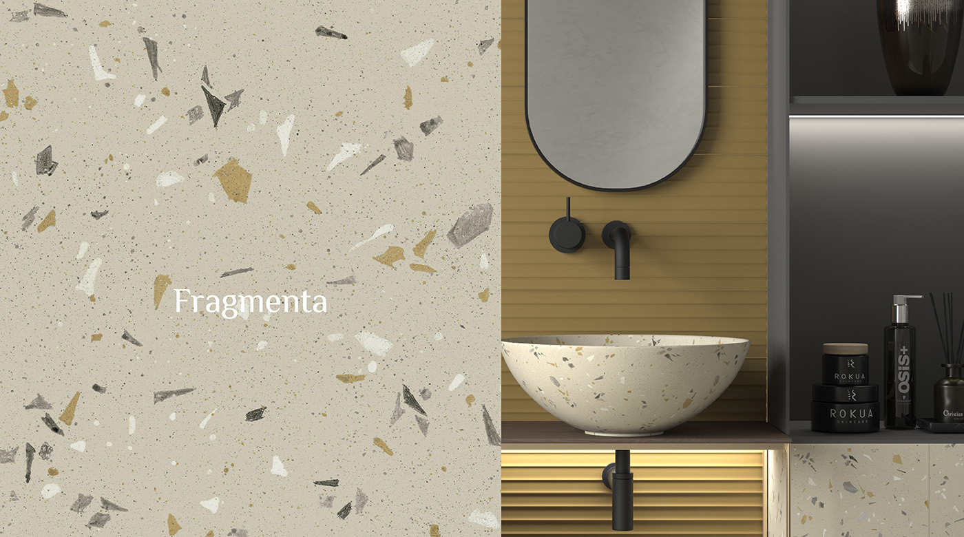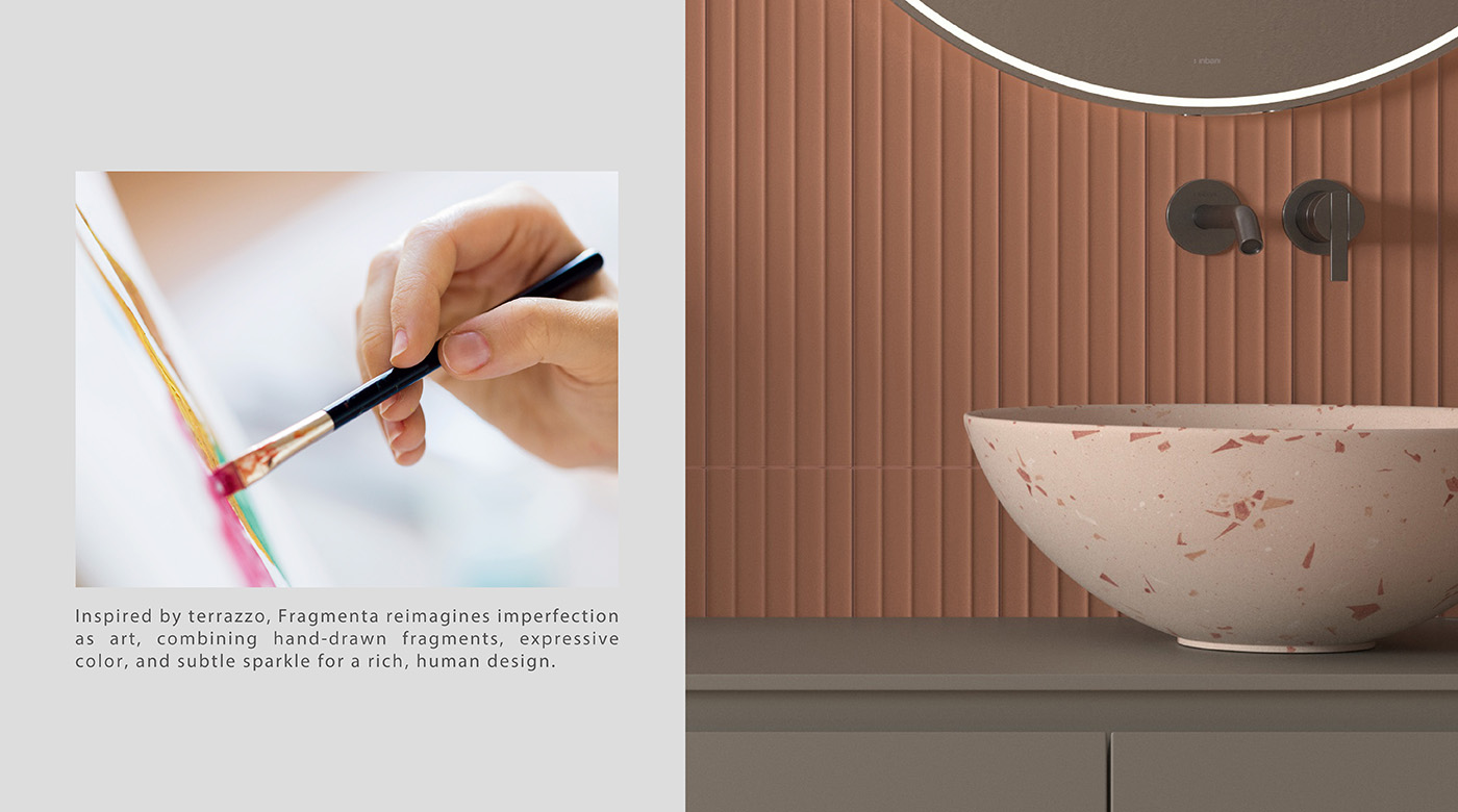 Fragmenta系列,以色彩與手繪筆觸為語言,展現有層次的藝術表情。色彩碎片如筆觸般散落於柔和底色之上,隱約閃現細緻光澤,呈現自然生命力與豐富視覺。