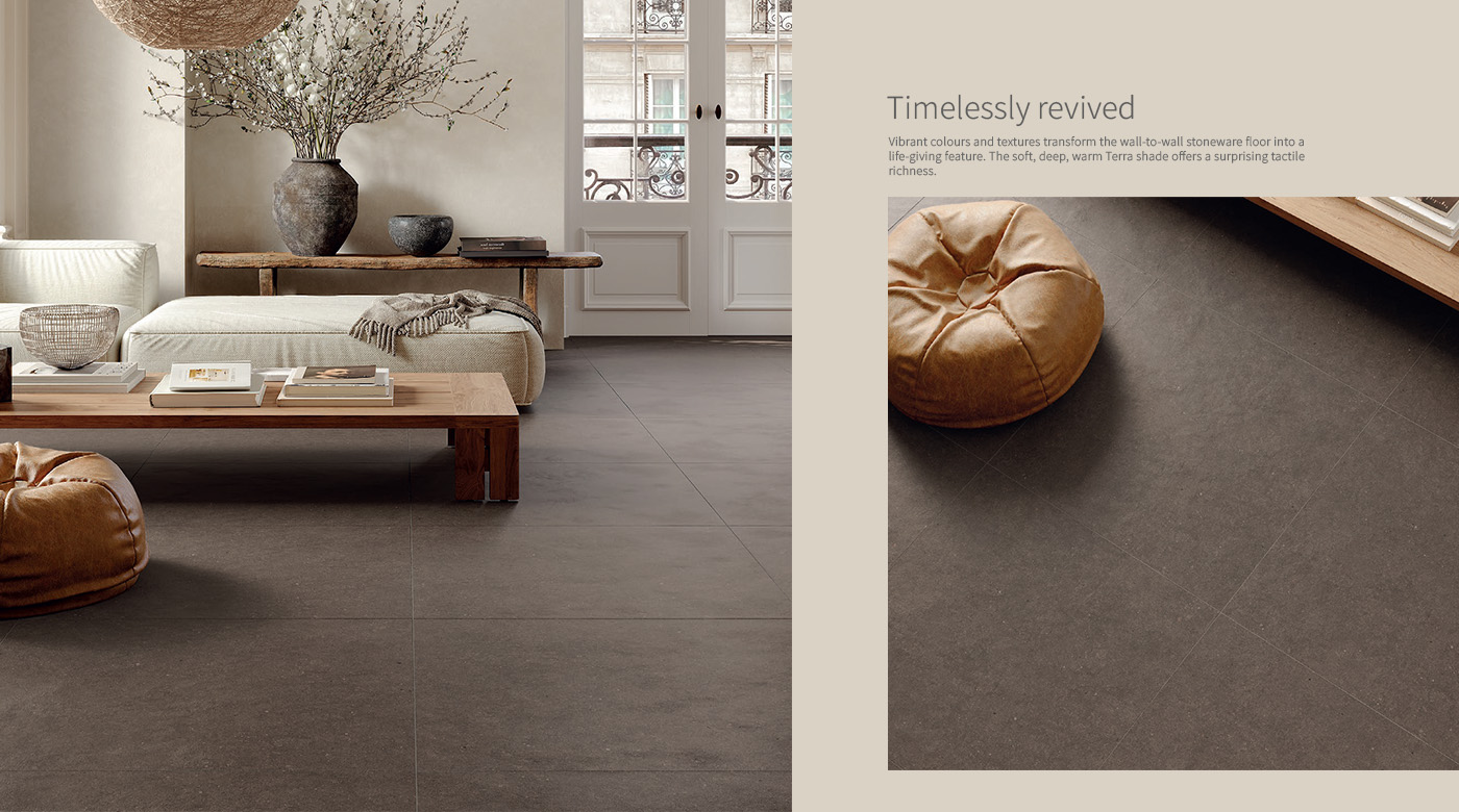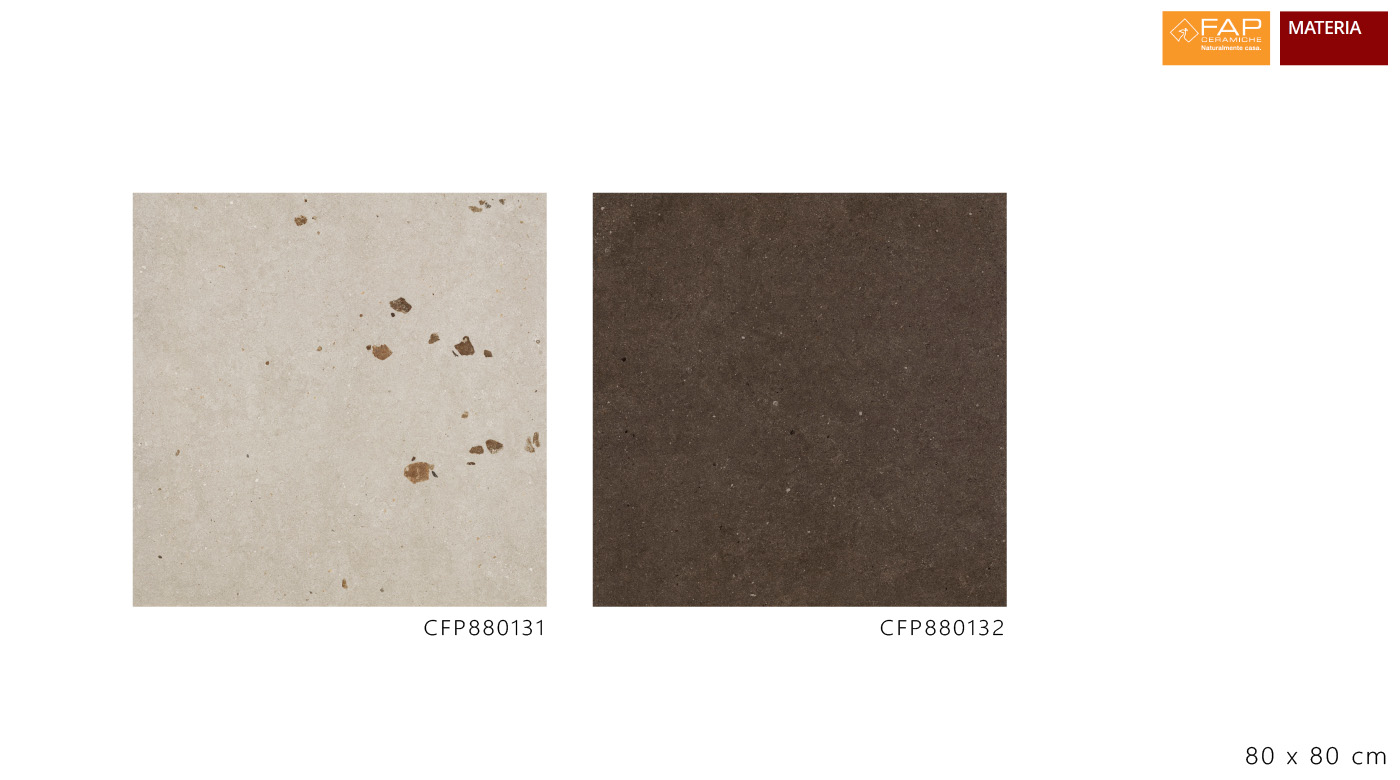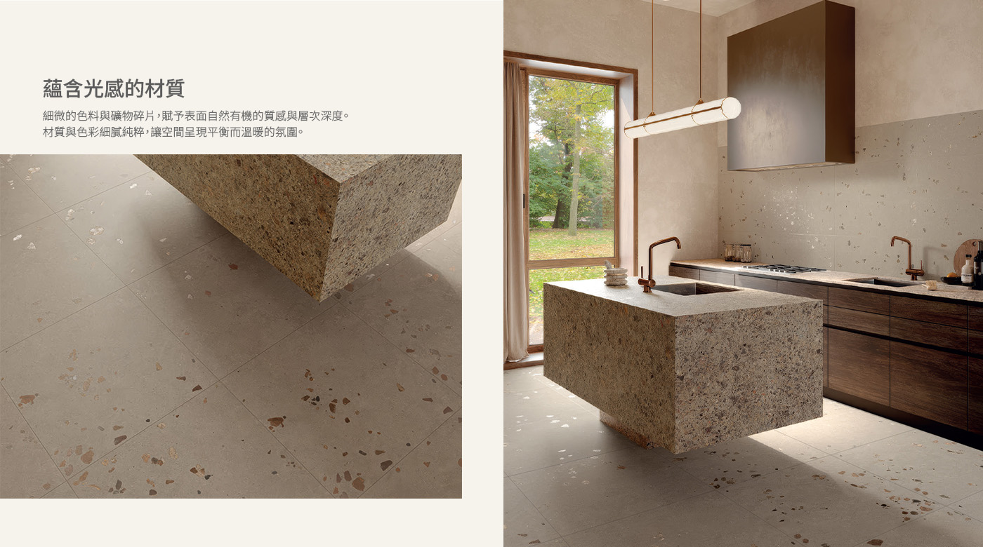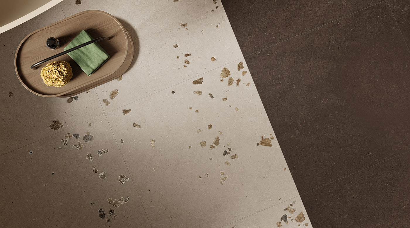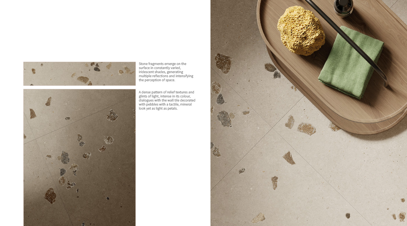 MATERIA 系列,濃烈色彩中的紋理與光澤細節,與飾有卵石裝飾的牆磚形成視覺對話;牆面呈現可觸的礦物質感,同時保有花瓣般的輕盈細緻。