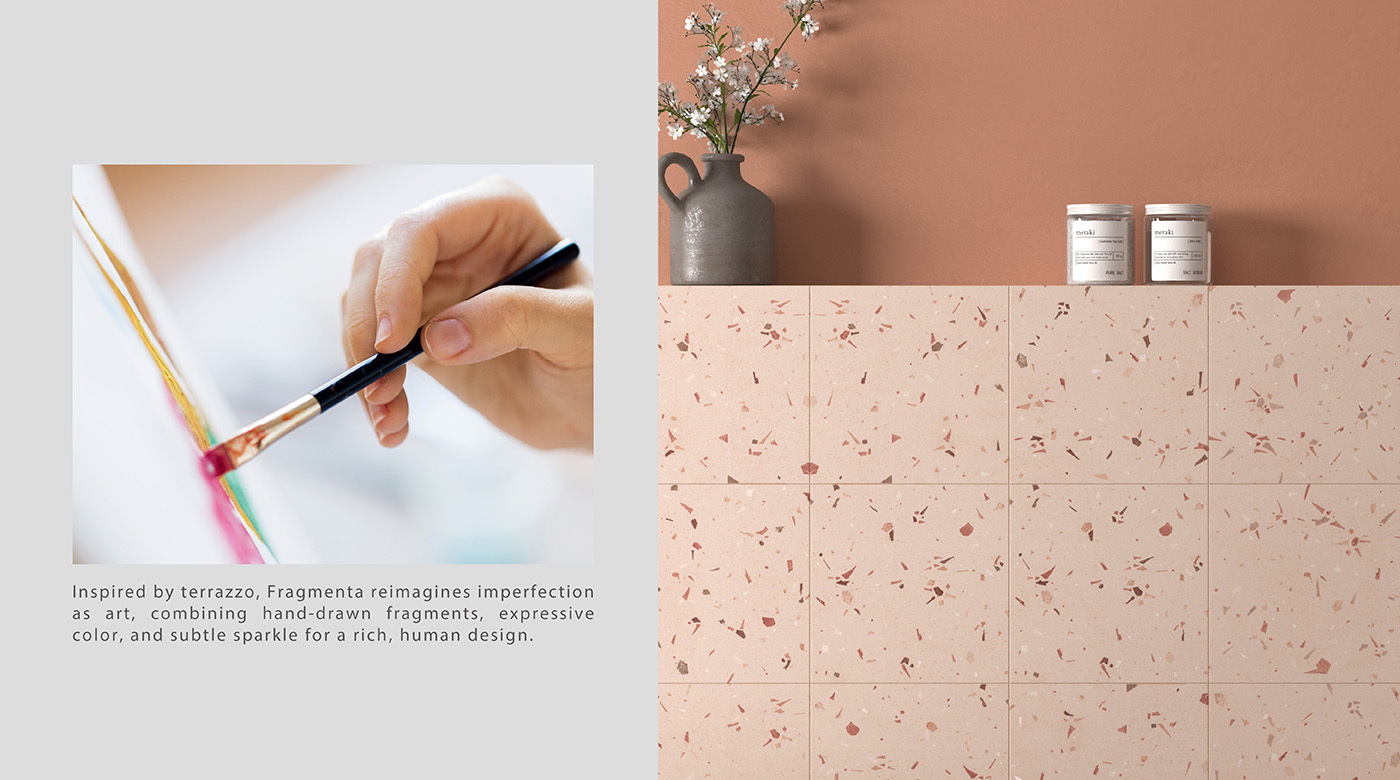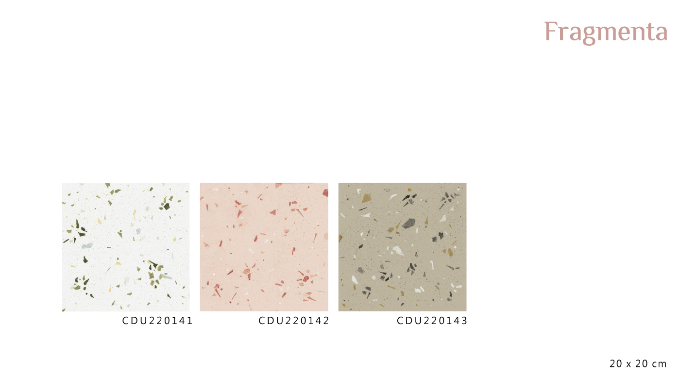 Fragmenta系列,以色彩與手繪筆觸為語言,展現有層次的藝術表情。色彩碎片如筆觸般散落於柔和底色之上,隱約閃現細緻光澤,呈現自然生命力與豐富視覺。