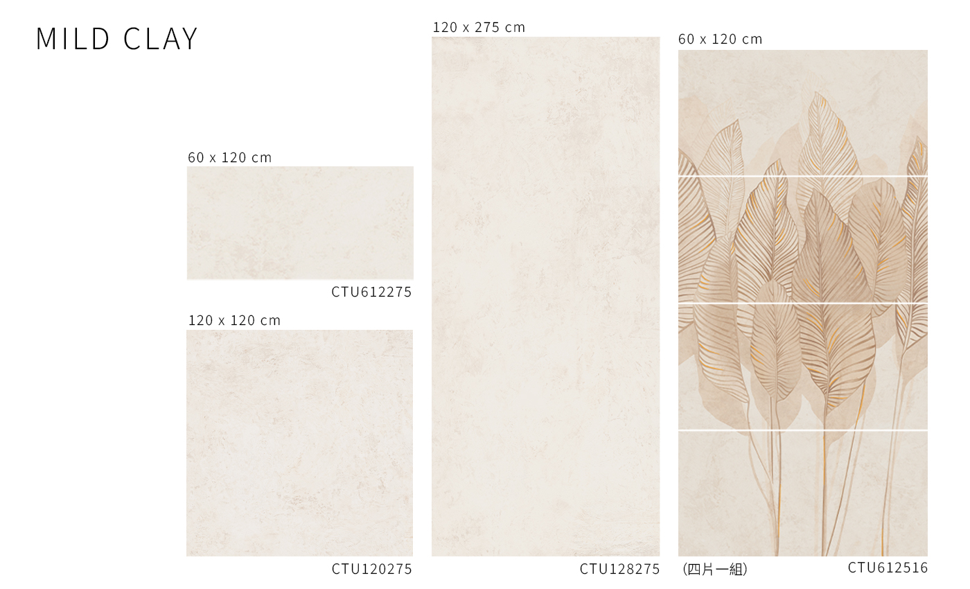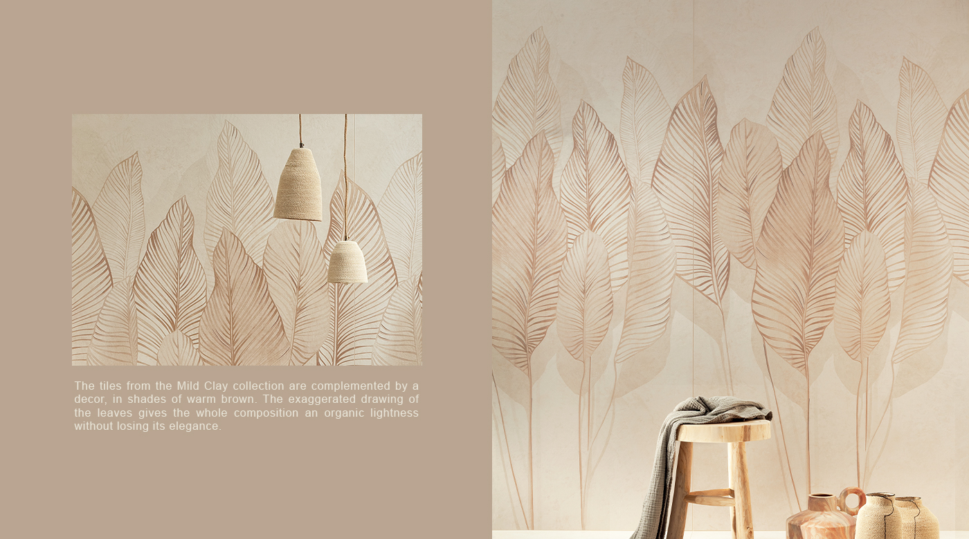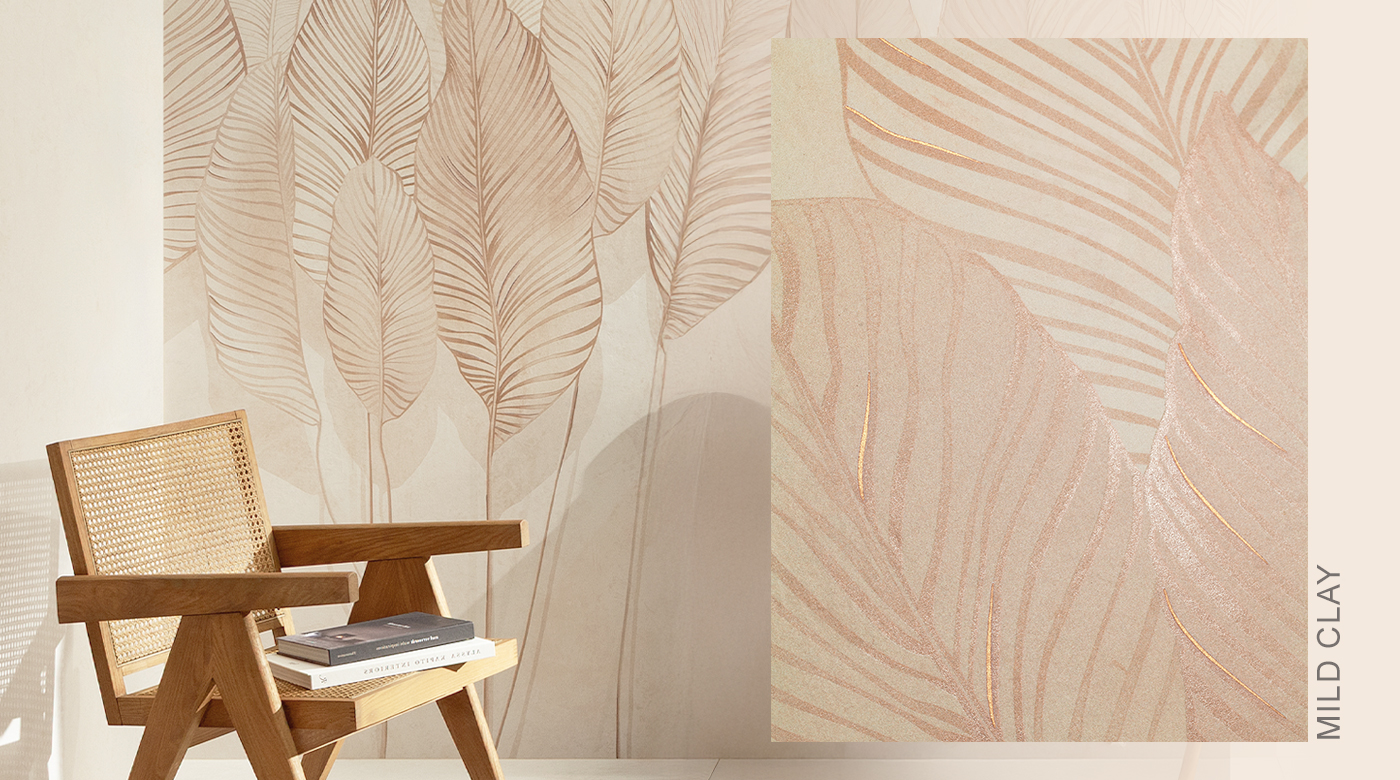 Mild Clay 以細緻的表面紋理為特色。為室內空間帶來平衡與寧靜,不喧賓奪主,卻清楚展現自身存在。放大的葉片圖樣為整體構成注入有機的輕盈感,同時保留優雅氣質。