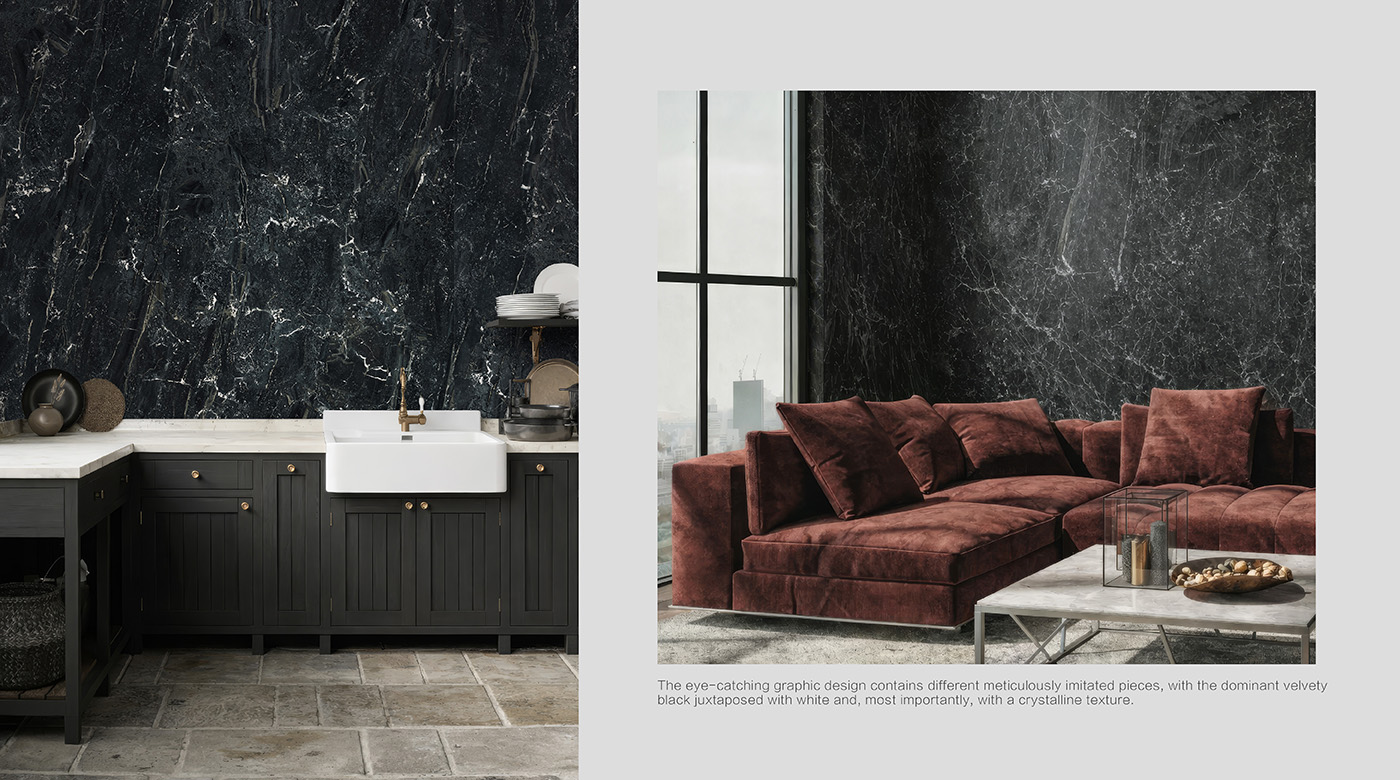 靈感承襲比利時格蘭德諾瓦石的天然肌理與礦物結構,透過細膩演繹,重現其複雜紋理與鮮明對比所帶來的動態美感。黑白色調在絲絨般質感中交錯鋪陳,營造沉穩卻不失張力的整體氛圍。