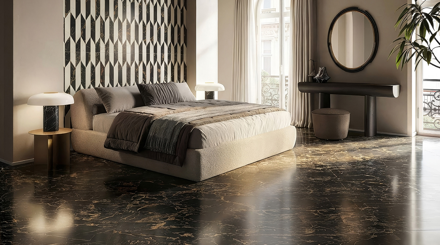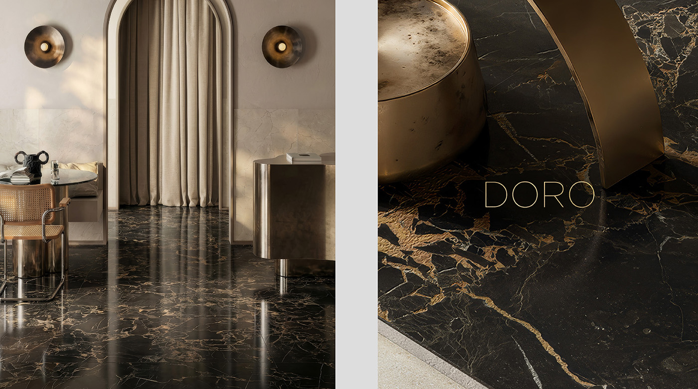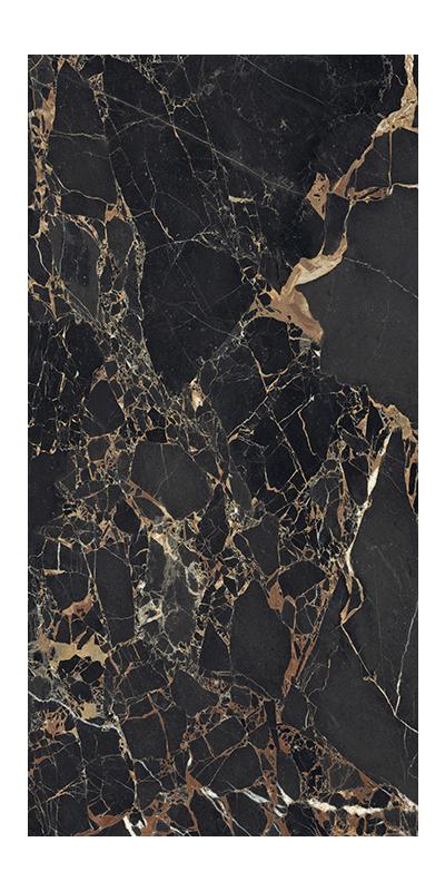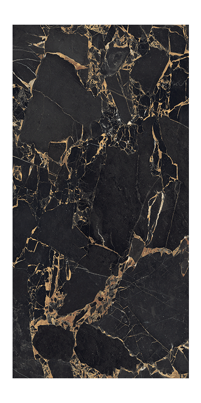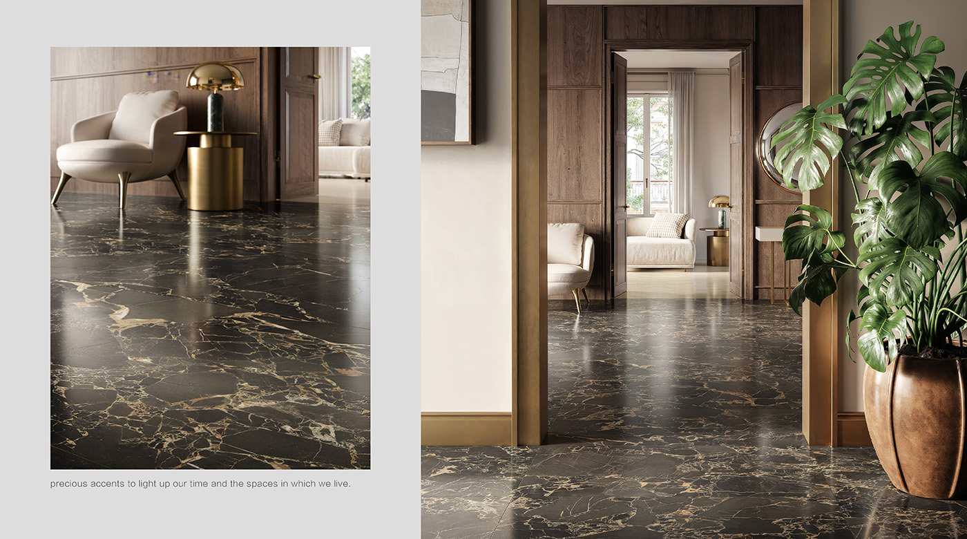 將千年的自然詩意,凝結於磚面之上。在極致深邃的墨黑之中,閃耀的金絲紋理如流雲般交織蔓延,散發著一種令人深深著迷、無法移開目光的優雅氣質。