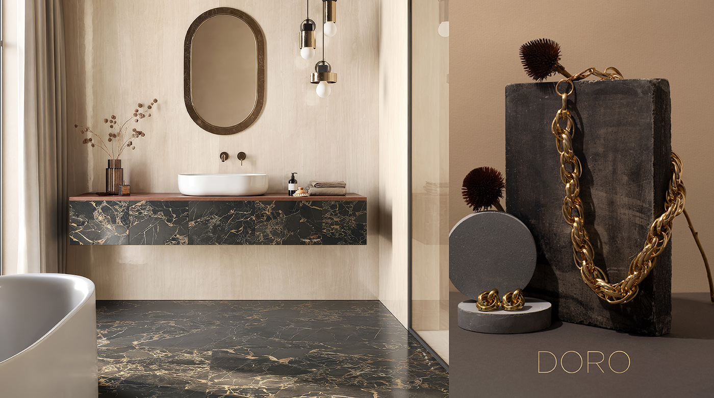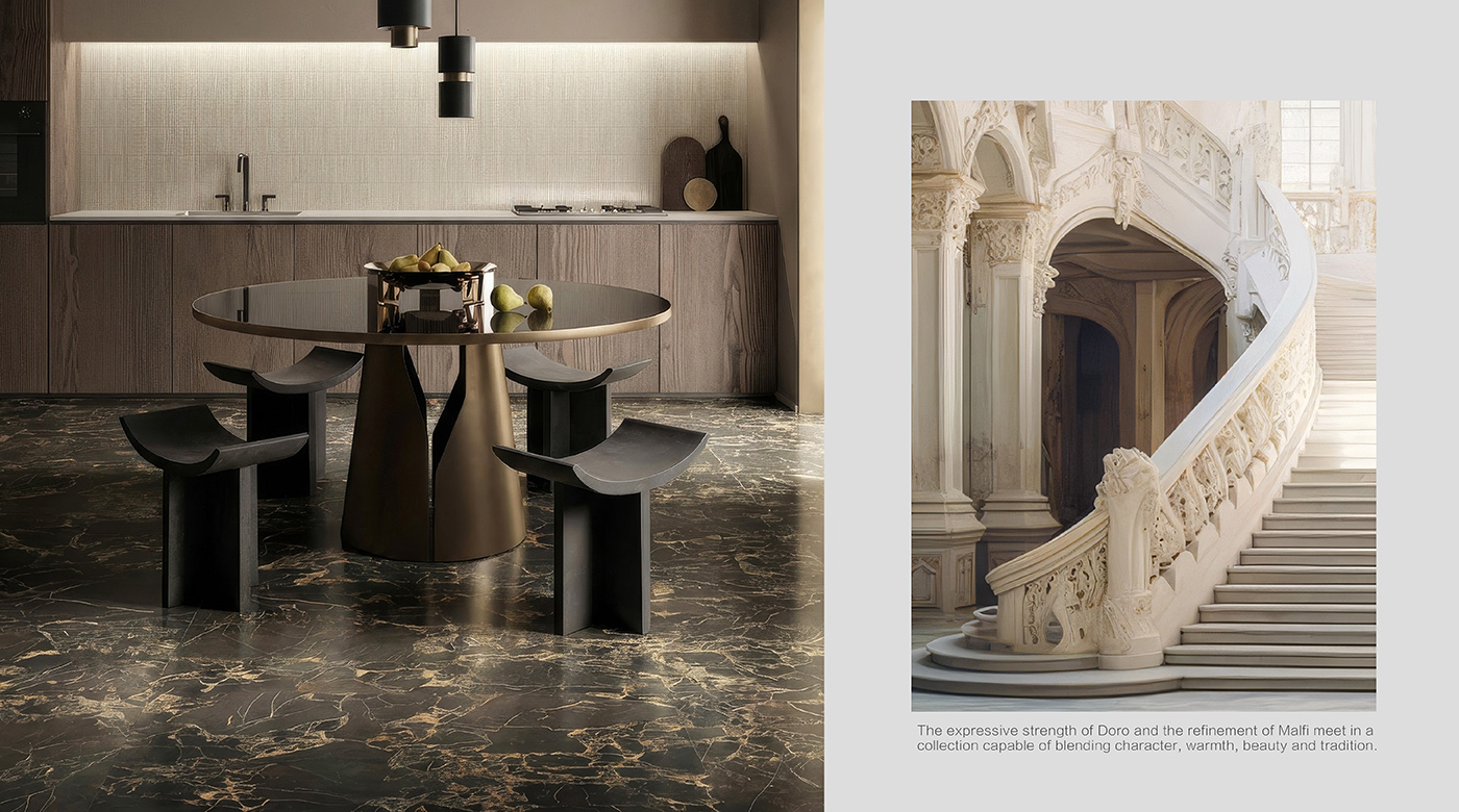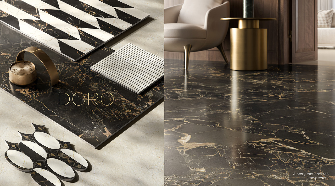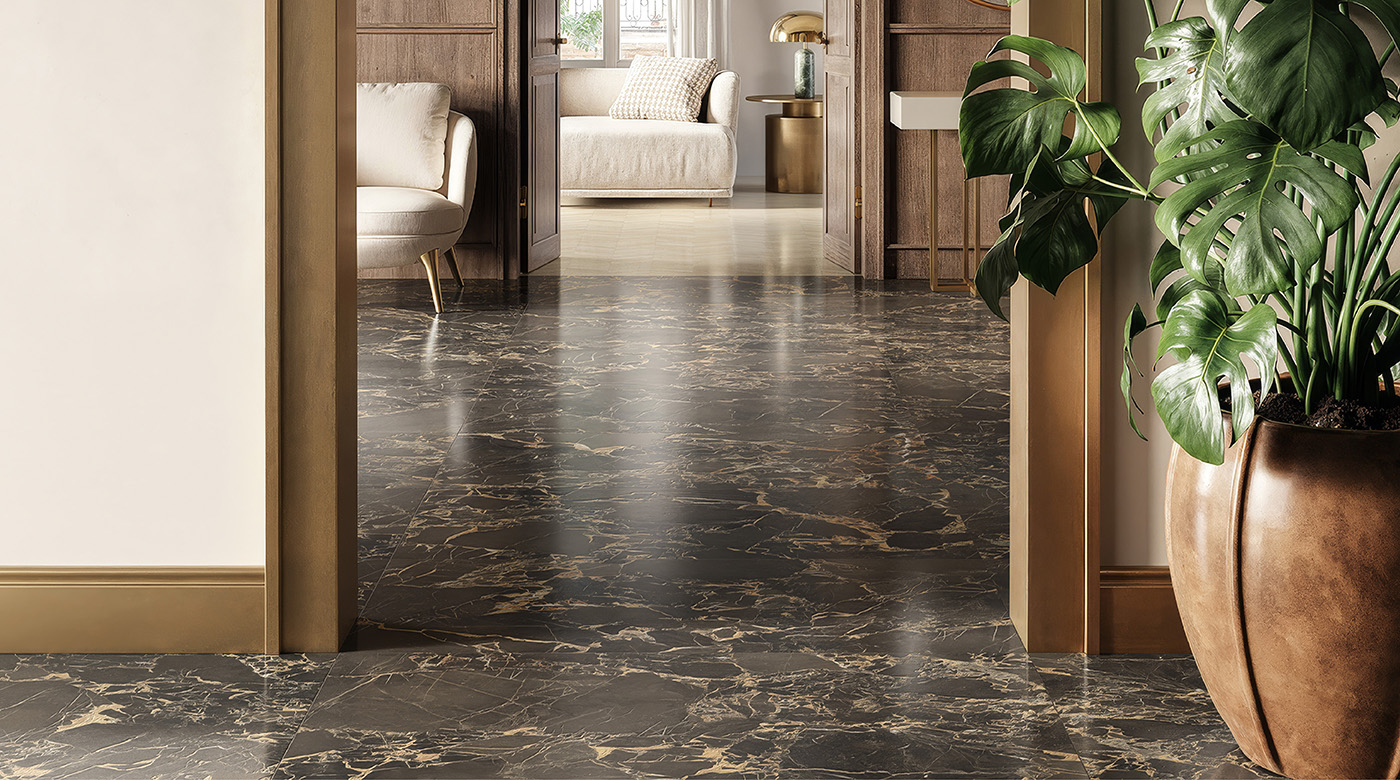 將千年的自然詩意,凝結於磚面之上。在極致深邃的墨黑之中,閃耀的金絲紋理如流雲般交織蔓延,散發著一種令人深深著迷、無法移開目光的優雅氣質。